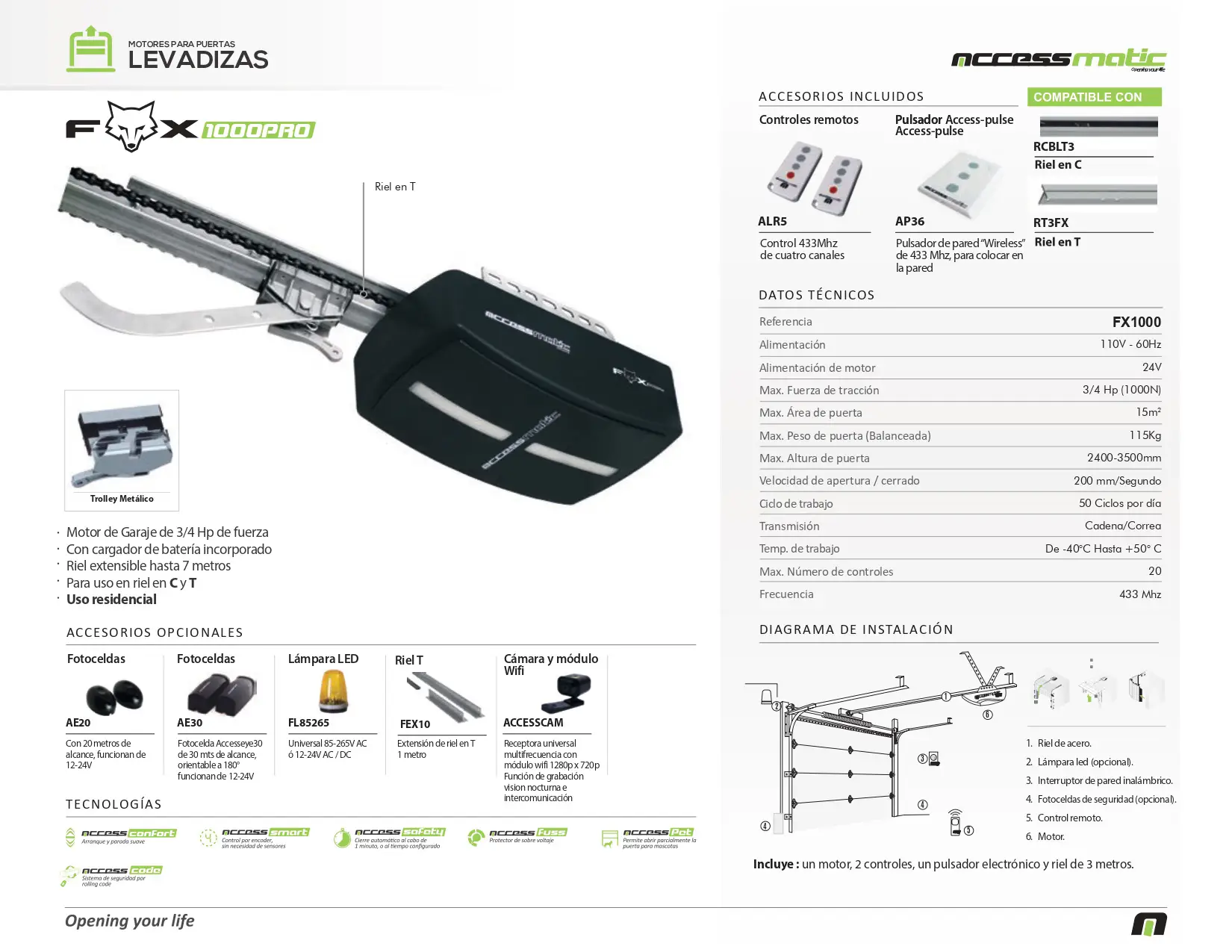 El FOX 1000PRO es un motor de garaje diseñado para uso residencial, fabricado por la marca Accessmatic. Con una fuerza de tracción de 3/4 Hp, es capaz de mover puertas de garaje de hasta 115 kg de peso y 15 metros cuadrados de área.
